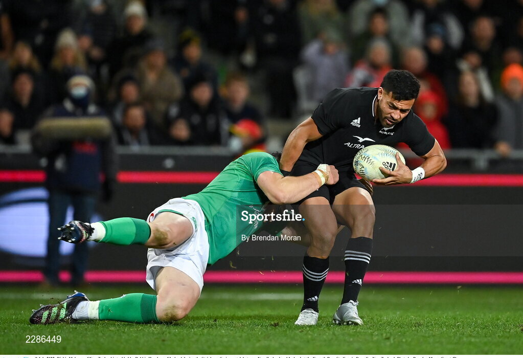 9 July 2022; Richie Mo'unga of New Zealand is tackled by Robbie Henshaw of Ireland during the Steinlager Series match between New Zealand and Ireland at the Forsyth Barr Stadium in Dunedin, New Zealand. Photo by Brendan Moran/Sportsfile