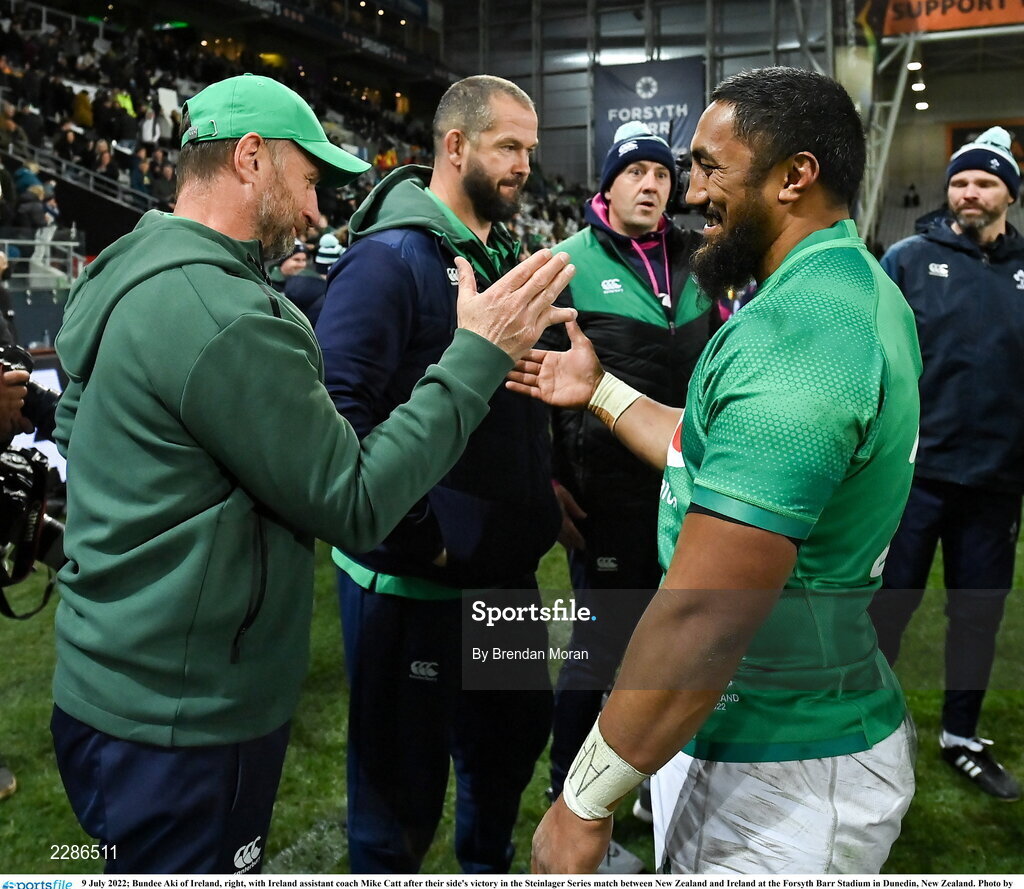 9 July 2022; Bundee Aki of Ireland, right, with Ireland assistant coach Mike Catt after their side's victory in the Steinlager Series match between New Zealand and Ireland at the Forsyth Barr Stadium in Dunedin, New Zealand. Photo by Brendan Moran/Sportsfile