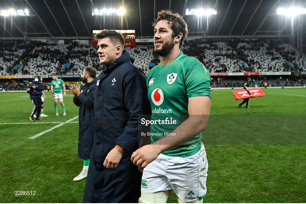9 July 2022; Dan Sheehan, left, and Caelan Doris of Ireland after their side's victory in the Steinlager Series match between New Zealand and Ireland at the Forsyth Barr Stadium in Dunedin, New Zealand. Photo by Brendan Moran/Sportsfile