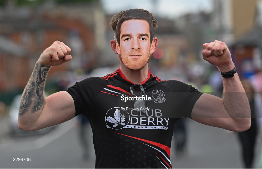 9 July 2022; A Derry supporter, wearing a Benny Heron mask, before the GAA Football All-Ireland Senior Championship Semi-Final match between Derry and Galway at Croke Park in Dublin. Photo by Ramsey Cardy/Sportsfile