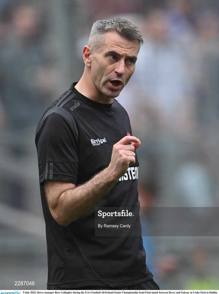 9 July 2022; Derry manager Rory Gallagher during the GAA Football All-Ireland Senior Championship Semi-Final match between Derry and Galway at Croke Park in Dublin. Photo by Ramsey Cardy/Sportsfile