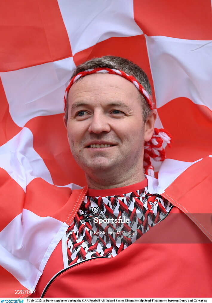 9 July 2022; A Derry supporter during the GAA Football All-Ireland Senior Championship Semi-Final match between Derry and Galway at Croke Park in Dublin. Photo by Stephen McCarthy/Sportsfile