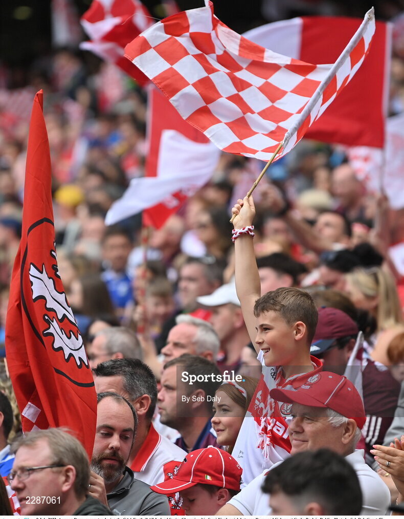 9 July 2022; A young Derry supporter during the GAA Football All-Ireland Senior Championship Semi-Final match between Derry and Galway at Croke Park in Dublin. Photo by Seb Daly/Sportsfile