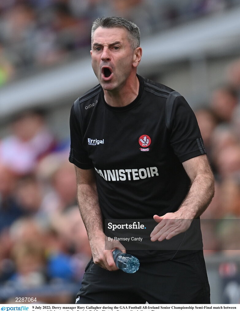 9 July 2022; Derry manager Rory Gallagher during the GAA Football All-Ireland Senior Championship Semi-Final match between Derry and Galway at Croke Park in Dublin. Photo by Ramsey Cardy/Sportsfile