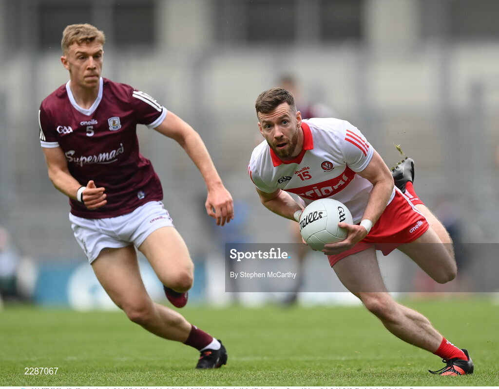 9 July 2022; Niall Loughlin of Derry in action against Dylan McHugh of Galway during the GAA Football All-Ireland Senior Championship Semi-Final match between Derry and Galway at Croke Park in Dublin. Photo by Stephen McCarthy/Sportsfile
