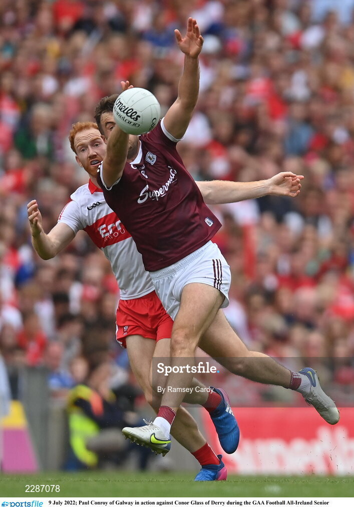 9 July 2022; Paul Conroy of Galway in action against Conor Glass of Derry during the GAA Football All-Ireland Senior Championship Semi-Final match between Derry and Galway at Croke Park in Dublin. Photo by Ramsey Cardy/Sportsfile