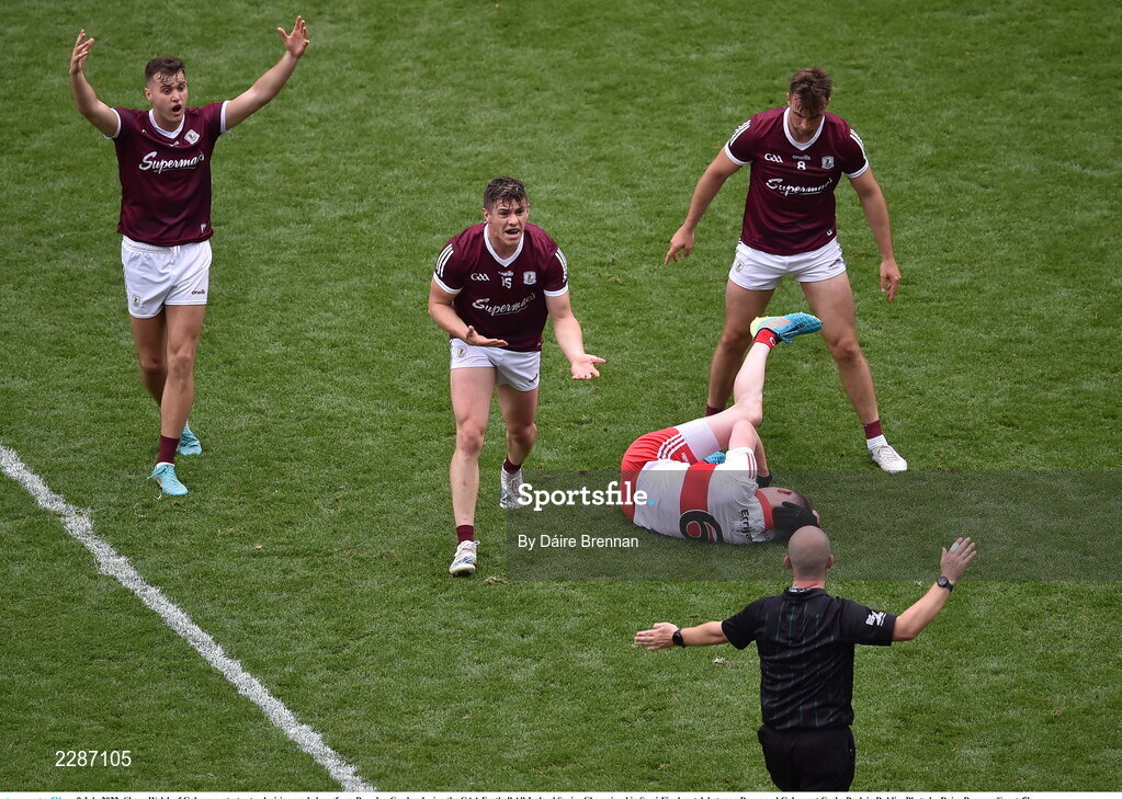 9 July 2022; Shane Walsh of Galway protests at a decision made by referee Brendan Cawley during the GAA Football All-Ireland Senior Championship Semi-Final match between Derry and Galway at Croke Park in Dublin. Photo by Daire Brennan/Sportsfile