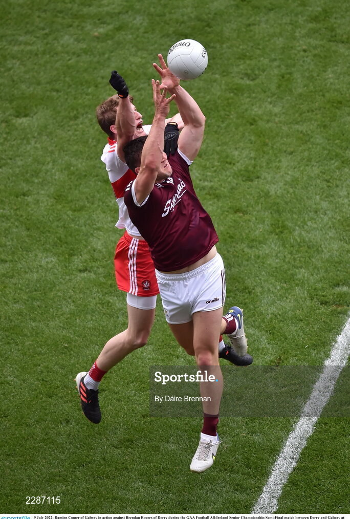 9 July 2022; Damien Comer of Galway in action against Brendan Rogers of Derry during the GAA Football All-Ireland Senior Championship Semi-Final match between Derry and Galway at Croke Park in Dublin. Photo by Daire Brennan/Sportsfile