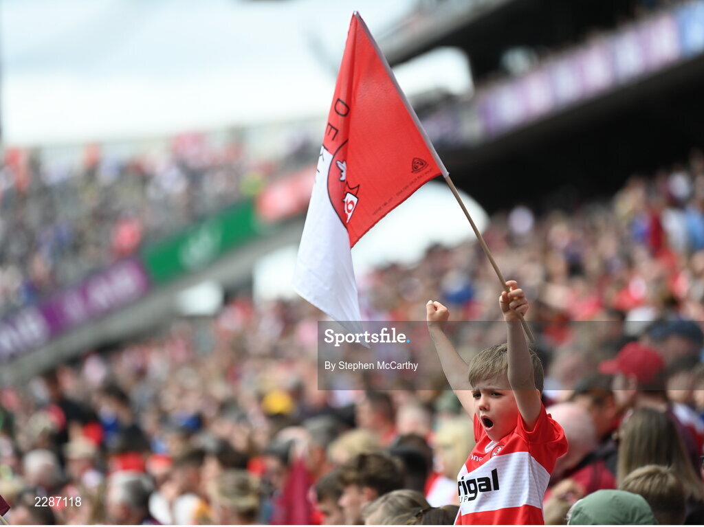 9 July 2022; A young Derry supporter during the GAA Football All-Ireland Senior Championship Semi-Final match between Derry and Galway at Croke Park in Dublin. Photo by Stephen McCarthy/Sportsfile
