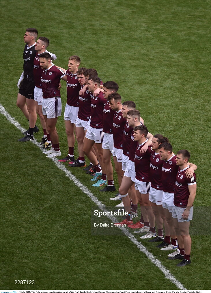 9 July 2022; The Galway team stand together ahead of the GAA Football All-Ireland Senior Championship Semi-Final match between Derry and Galway at Croke Park in Dublin. Photo by Daire Brennan/Sportsfile