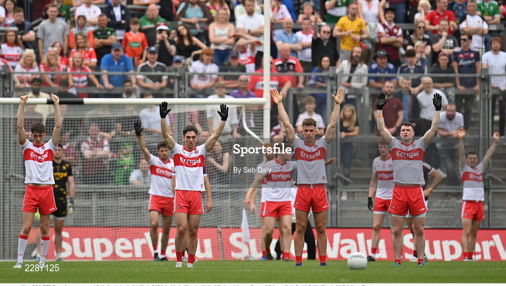 9 July 2022; Derry players prepare to defend a free during the GAA Football All-Ireland Senior Championship Semi-Final match between Derry and Galway at Croke Park in Dublin. Photo by Seb Daly/Sportsfile