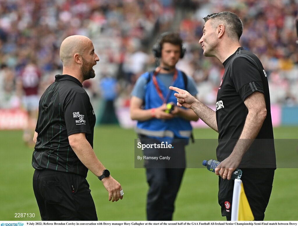 9 July 2022; Referee Brendan Cawley in conversation with Derry manager Rory Gallagher at the start of the second half of the GAA Football All-Ireland Senior Championship Semi-Final match between Derry and Galway at Croke Park in Dublin. Photo by Ramsey Cardy/Sportsfile