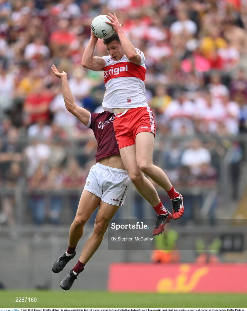 9 July 2022; Emmett Bradley of Derry in action against Seán Kelly of Galway during the GAA Football All-Ireland Senior Championship Semi-Final match between Derry and Galway at Croke Park in Dublin. Photo by Stephen McCarthy/Sportsfile