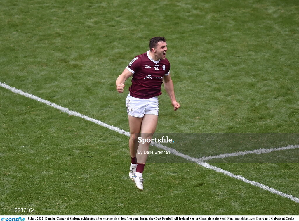 9 July 2022; Damien Comer of Galway celebrates after scoring his side's first goal during the GAA Football All-Ireland Senior Championship Semi-Final match between Derry and Galway at Croke Park in Dublin. Photo by Daire Brennan/Sportsfile