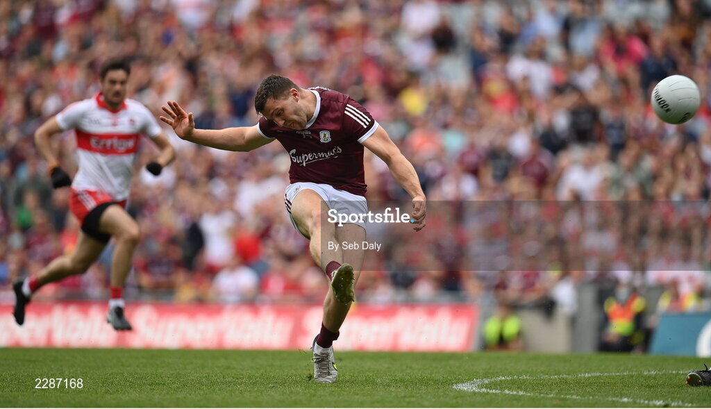 9 July 2022; Damien Comer of Galway scores his side's second goal during the GAA Football All-Ireland Senior Championship Semi-Final match between Derry and Galway at Croke Park in Dublin. Photo by Seb Daly/Sportsfile
