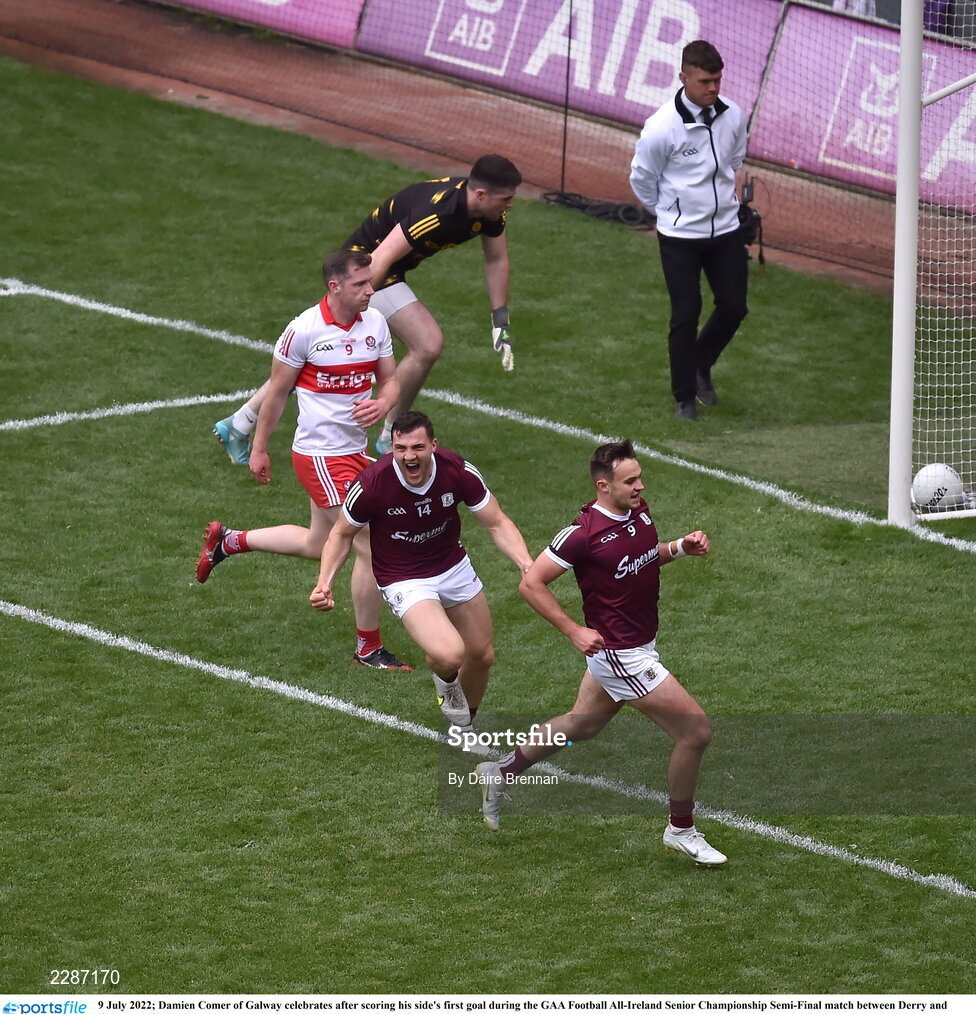 9 July 2022; Damien Comer of Galway celebrates after scoring his side's first goal during the GAA Football All-Ireland Senior Championship Semi-Final match between Derry and Galway at Croke Park in Dublin. Photo by Daire Brennan/Sportsfile