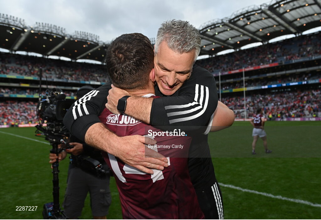 9 July 2022; Galway manager Padraic Joyce celebrates with Damien Comer of Galway after the GAA Football All-Ireland Senior Championship Semi-Final match between Derry and Galway at Croke Park in Dublin. Photo by Ramsey Cardy/Sportsfile