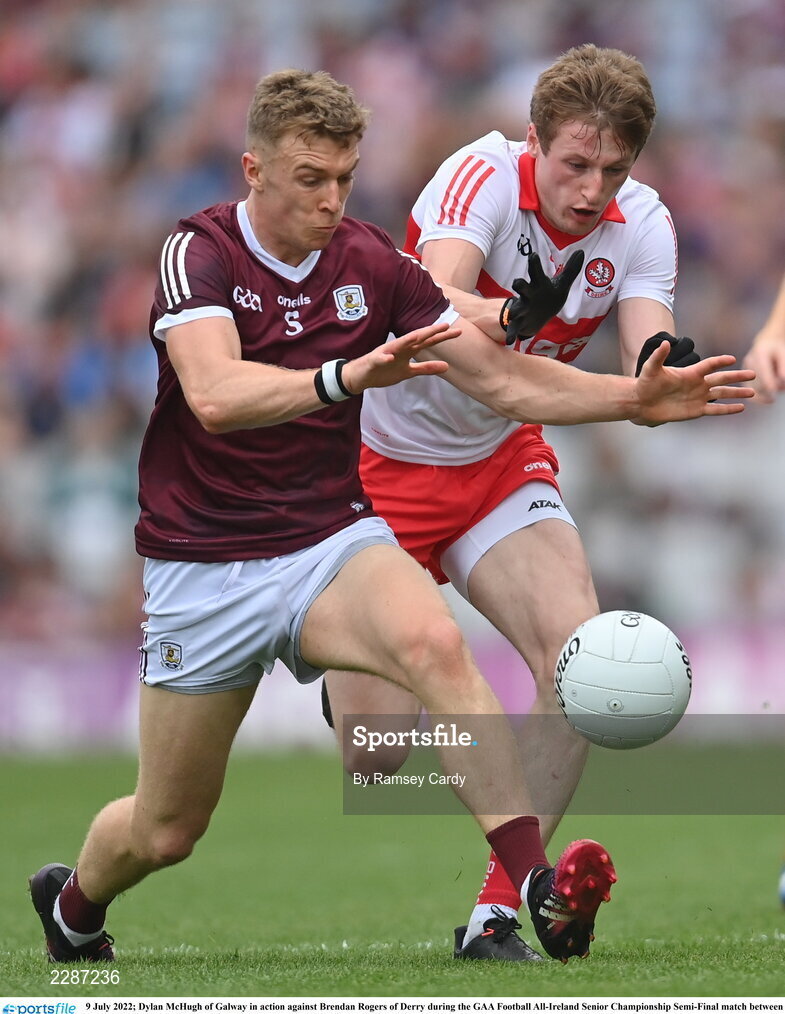 9 July 2022; Dylan McHugh of Galway in action against Brendan Rogers of Derry during the GAA Football All-Ireland Senior Championship Semi-Final match between Derry and Galway at Croke Park in Dublin. Photo by Ramsey Cardy/Sportsfile