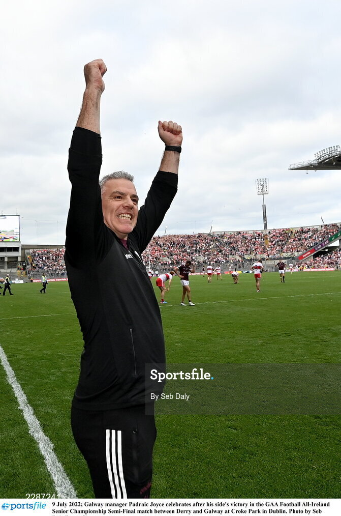 9 July 2022; Galway manager Padraic Joyce celebrates after his side's victory in the GAA Football All-Ireland Senior Championship Semi-Final match between Derry and Galway at Croke Park in Dublin. Photo by Seb Daly/Sportsfile