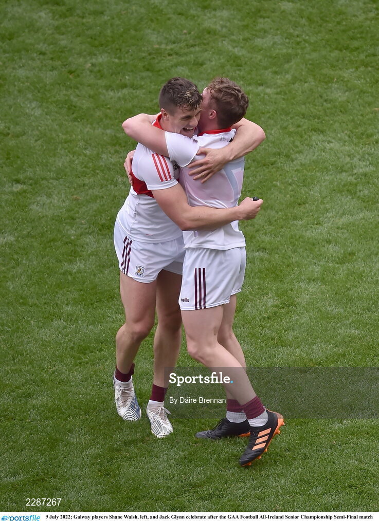 9 July 2022; Galway players Shane Walsh, left, and Jack Glynn celebrate after the GAA Football All-Ireland Senior Championship Semi-Final match between Derry and Galway at Croke Park in Dublin. Photo by Daire Brennan/Sportsfile