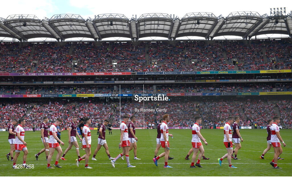 9 July 2022; Both teams parade before the GAA Football All-Ireland Senior Championship Semi-Final match between Derry and Galway at Croke Park in Dublin. Photo by Ramsey Cardy/Sportsfile