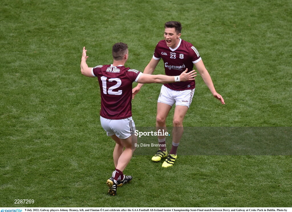 9 July 2022; Galway players Johnny Heaney, left, and Finnian Ó Laoi celebrate after the GAA Football All-Ireland Senior Championship Semi-Final match between Derry and Galway at Croke Park in Dublin. Photo by Daire Brennan/Sportsfile