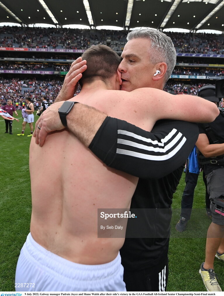 9 July 2022; Galway manager Padraic Joyce and Shane Walsh after their side's victory in the GAA Football All-Ireland Senior Championship Semi-Final match between Derry and Galway at Croke Park in Dublin. Photo by Seb Daly/Sportsfile