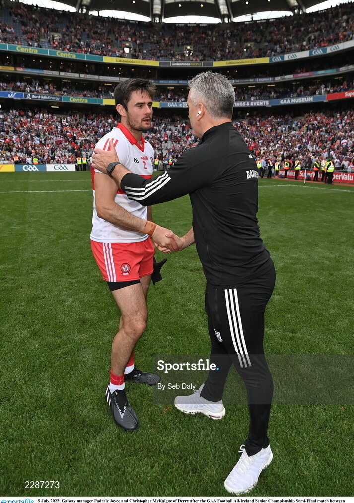 9 July 2022; Galway manager Padraic Joyce and Christopher McKaigue of Derry after the GAA Football All-Ireland Senior Championship Semi-Final match between Derry and Galway at Croke Park in Dublin. Photo by Seb Daly/Sportsfile