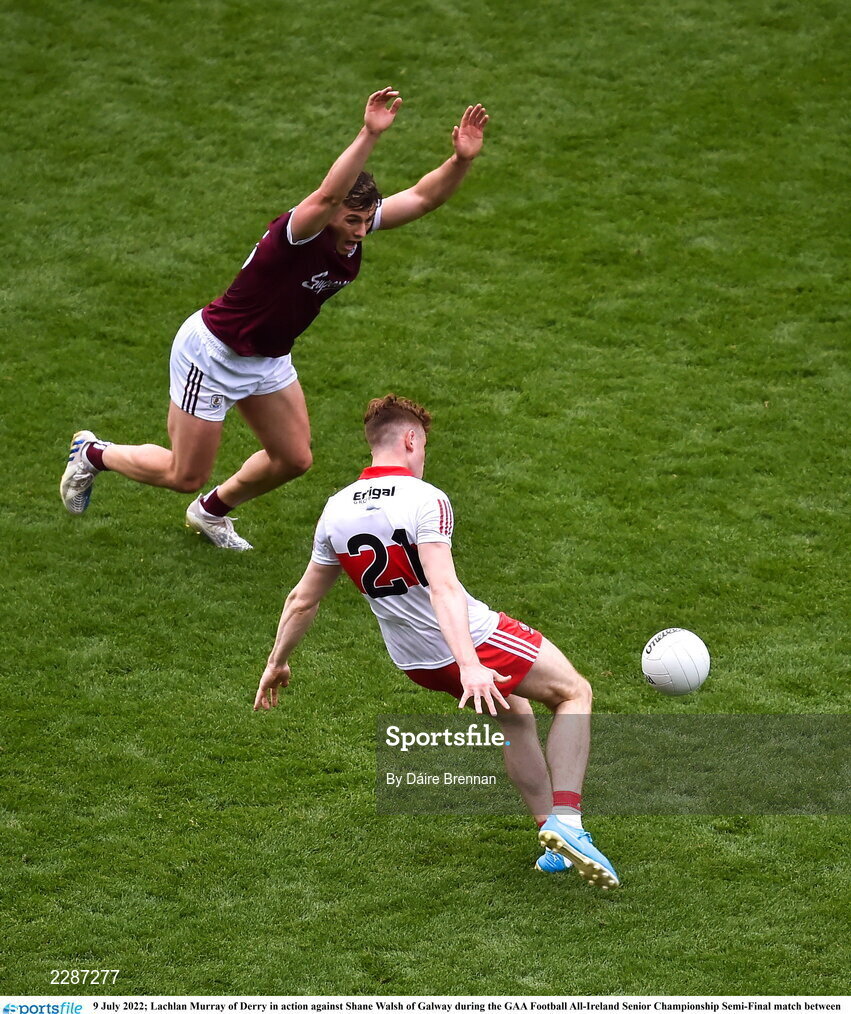 9 July 2022; Lachlan Murray of Derry in action against Shane Walsh of Galway during the GAA Football All-Ireland Senior Championship Semi-Final match between Derry and Galway at Croke Park in Dublin. Photo by Daire Brennan/Sportsfile