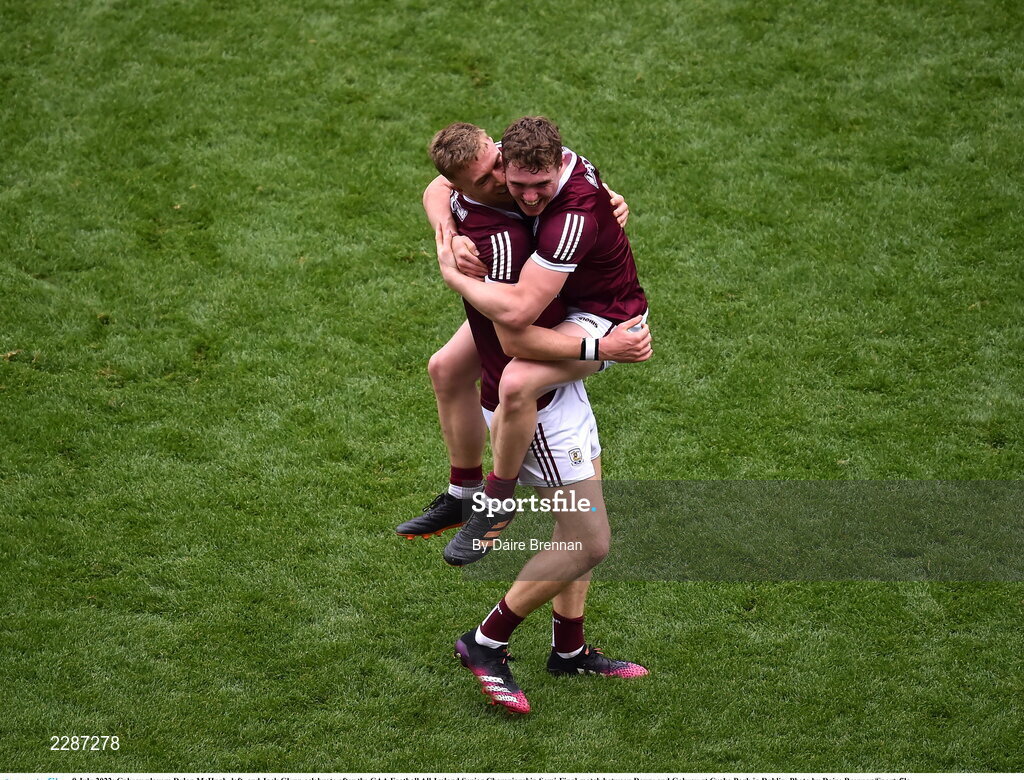 9 July 2022; Galway players Dylan McHugh, left, and Jack Glynn celebrate after the GAA Football All-Ireland Senior Championship Semi-Final match between Derry and Galway at Croke Park in Dublin. Photo by Daire Brennan/Sportsfile