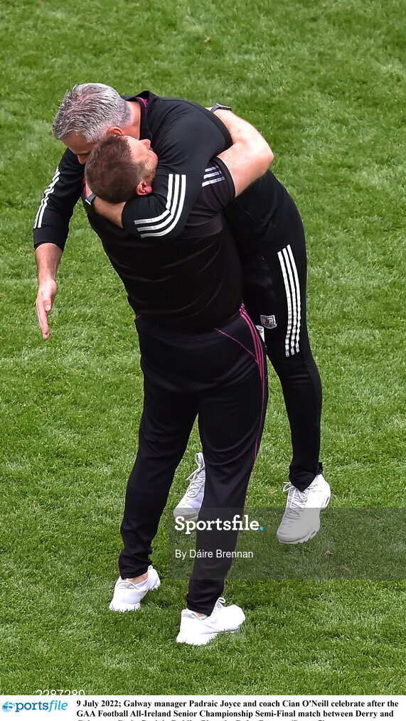 9 July 2022; Galway manager Padraic Joyce and coach Cian O'Neill celebrate after the GAA Football All-Ireland Senior Championship Semi-Final match between Derry and Galway at Croke Park in Dublin. Photo by Daire Brennan/Sportsfile