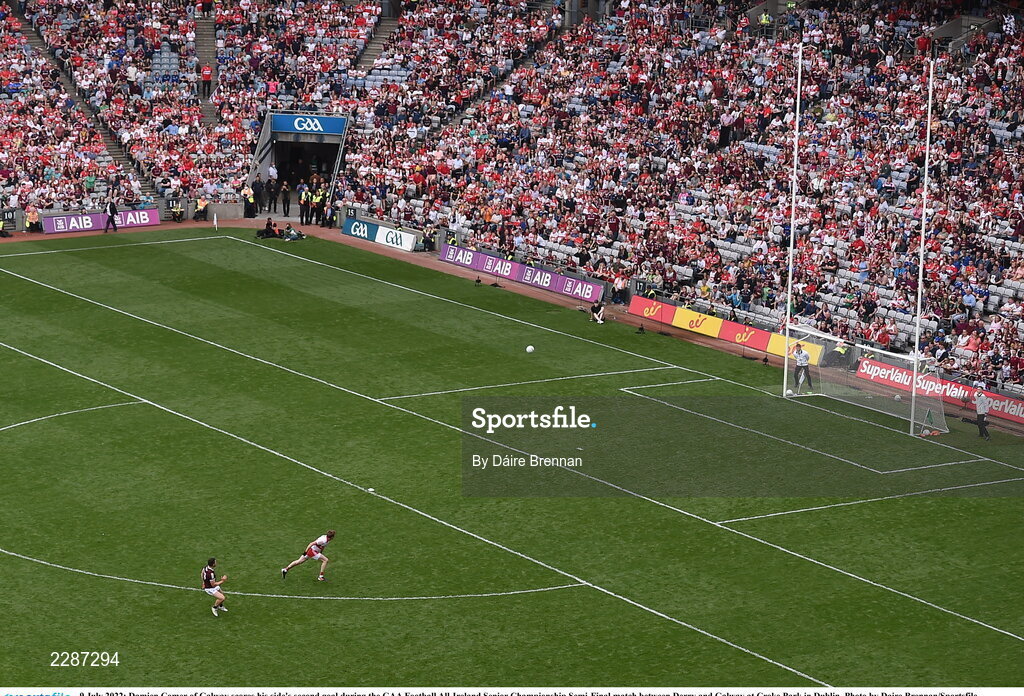 9 July 2022; Damien Comer of Galway scores his side's second goal during the GAA Football All-Ireland Senior Championship Semi-Final match between Derry and Galway at Croke Park in Dublin. Photo by Daire Brennan/Sportsfile
