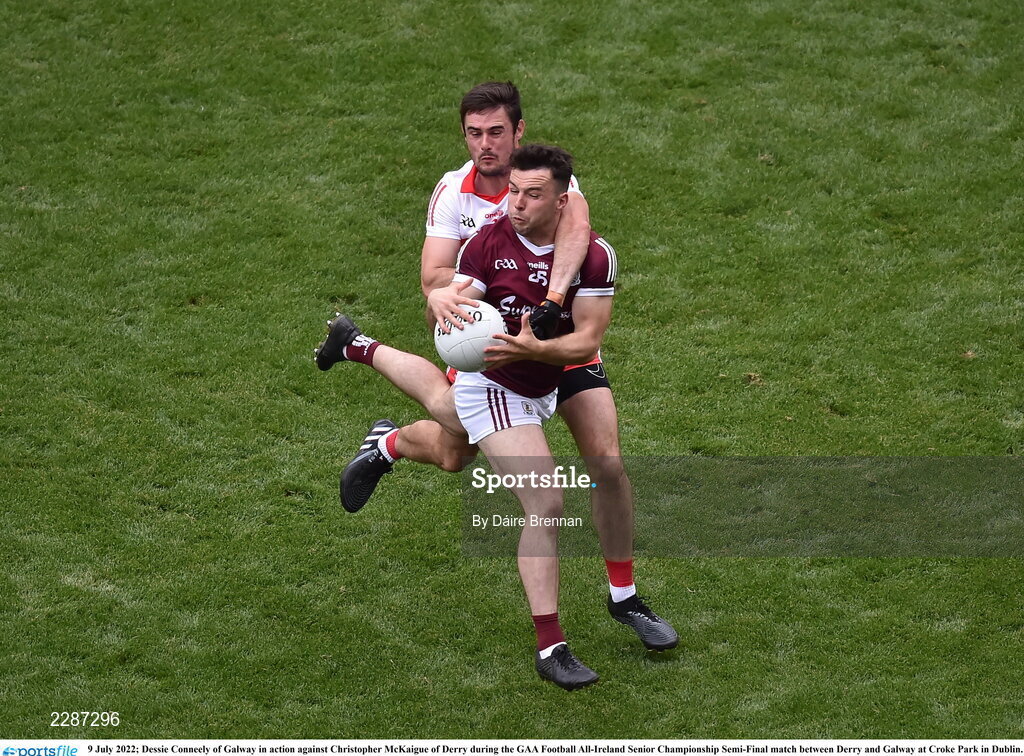 9 July 2022; Dessie Conneely of Galway in action against Christopher McKaigue of Derry during the GAA Football All-Ireland Senior Championship Semi-Final match between Derry and Galway at Croke Park in Dublin. Photo by Daire Brennan/Sportsfile