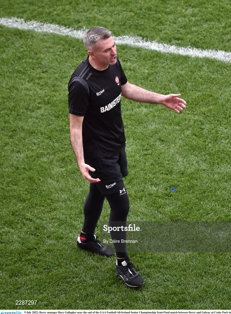 9 July 2022; Derry manager Rory Gallagher near the end of the GAA Football All-Ireland Senior Championship Semi-Final match between Derry and Galway at Croke Park in Dublin. Photo by Daire Brennan/Sportsfile