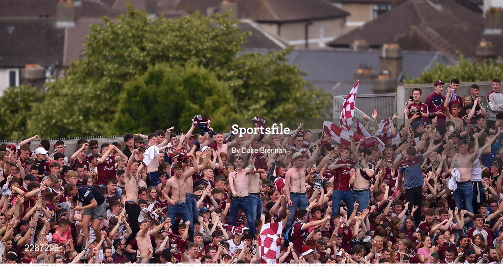 9 July 2022; Galway supporters on Hill 16 celebrate near the end of the GAA Football All-Ireland Senior Championship Semi-Final match between Derry and Galway at Croke Park in Dublin. Photo by Daire Brennan/Sportsfile