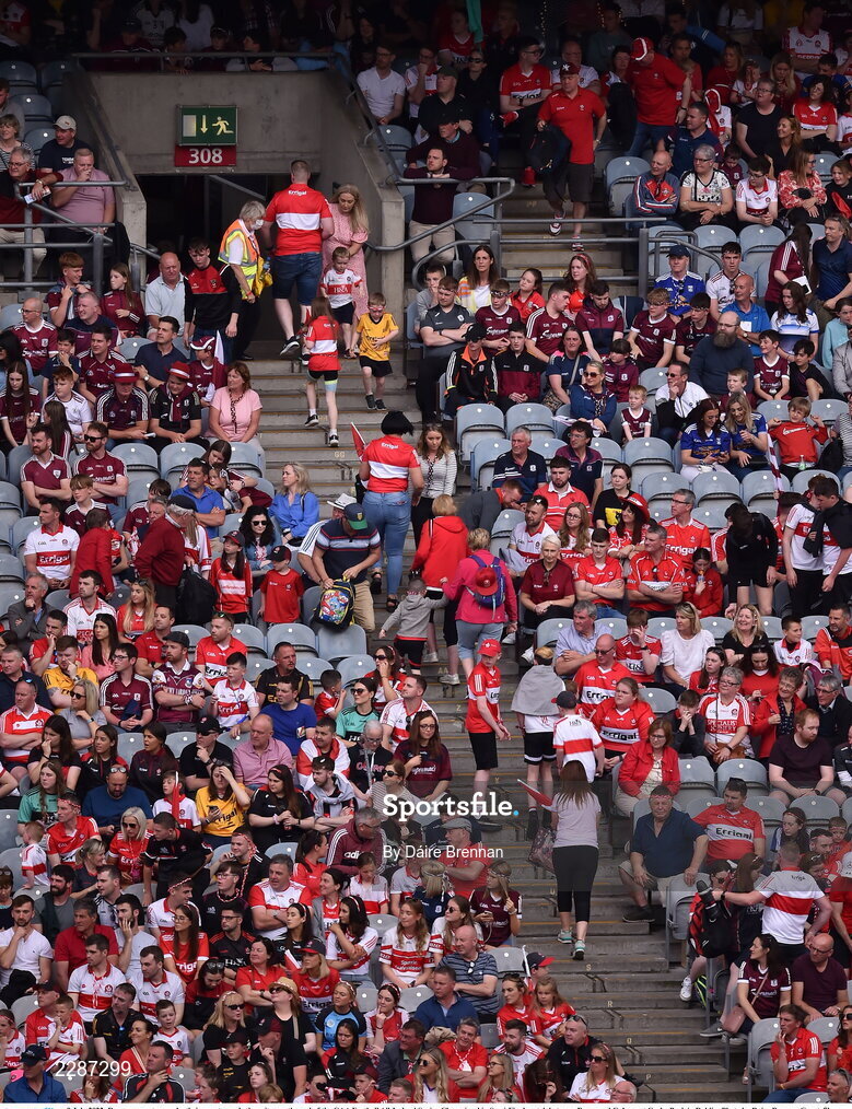 9 July 2022; Derry supporters make their way towards the exit near the end of the GAA Football All-Ireland Senior Championship Semi-Final match between Derry and Galway at Croke Park in Dublin. Photo by Daire Brennan/Sportsfile
