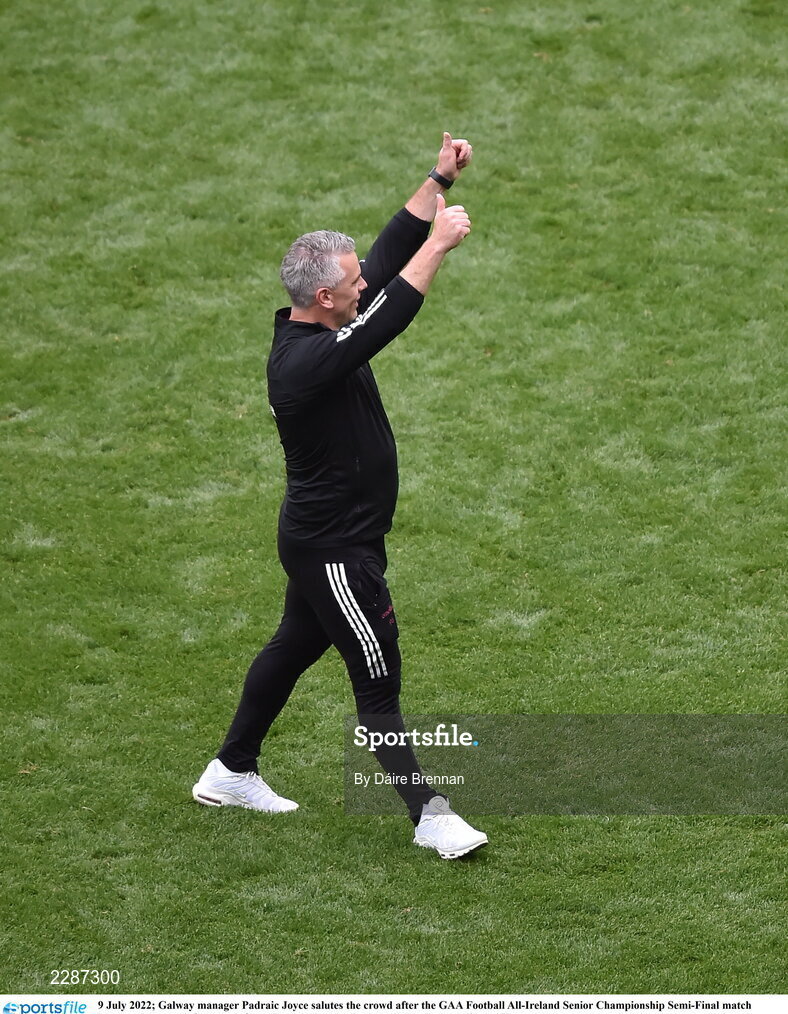 9 July 2022; Galway manager Padraic Joyce salutes the crowd after the GAA Football All-Ireland Senior Championship Semi-Final match between Derry and Galway at Croke Park in Dublin. Photo by Daire Brennan/Sportsfile