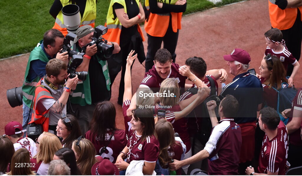 9 July 2022; Damien Comer of Galway celebrates with supporters after the GAA Football All-Ireland Senior Championship Semi-Final match between Derry and Galway at Croke Park in Dublin. Photo by Daire Brennan/Sportsfile