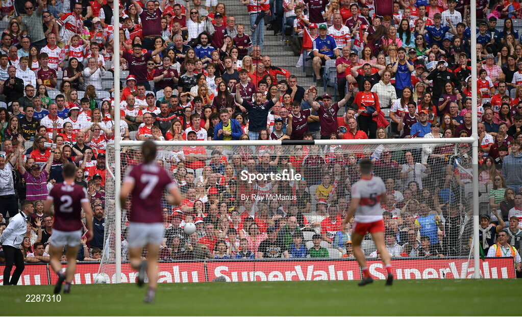 9 July 2022; The ball hits an empty net for the second Galway goal, scored by Damien Comer, during the GAA Football All-Ireland Senior Championship Semi-Final match between Derry and Galway at Croke Park in Dublin. Photo by Ray McManus/Sportsfile