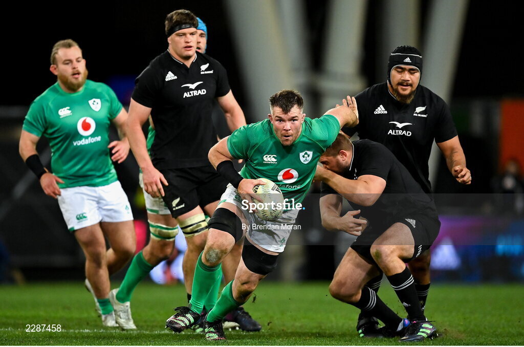 9 July 2022; Peter O’Mahony of Ireland breaks past the challenge of Aidan Ross of New Zealand during the Steinlager Series match between the New Zealand and Ireland at the Forsyth Barr Stadium in Dunedin, New Zealand. Photo by Brendan Moran/Sportsfile