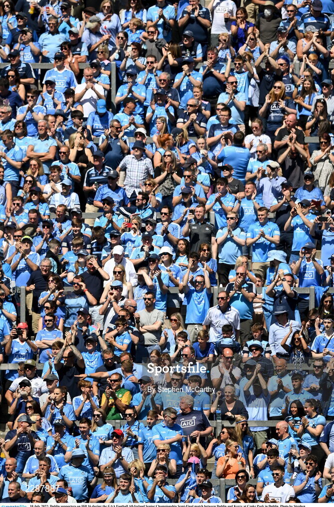 10 July 2022; Dublin supporters on Hill 16 during the GAA Football All-Ireland Senior Championship Semi-Final match between Dublin and Kerry at Croke Park in Dublin. Photo by Stephen McCarthy/Sportsfile