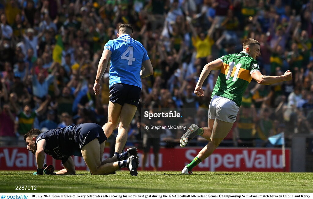 10 July 2022; Seán O'Shea of Kerry celebrates after scoring his side's first goal during the GAA Football All-Ireland Senior Championship Semi-Final match between Dublin and Kerry at Croke Park in Dublin. Photo by Stephen McCarthy/Sportsfile