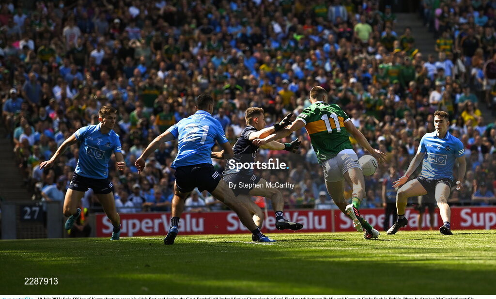 10 July 2022; Seán O'Shea of Kerry shoots to score his side's first goal during the GAA Football All-Ireland Senior Championship Semi-Final match between Dublin and Kerry at Croke Park in Dublin. Photo by Stephen McCarthy/Sportsfile