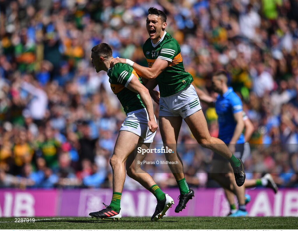 10 July 2022; Seán O'Shea of Kerry, left, celebrates with teammate David Clifford after scoring their side's first goal during the GAA Football All-Ireland Senior Championship Semi-Final match between Dublin and Kerry at Croke Park in Dublin. Photo by Piaras Ó Mídheach/Sportsfile