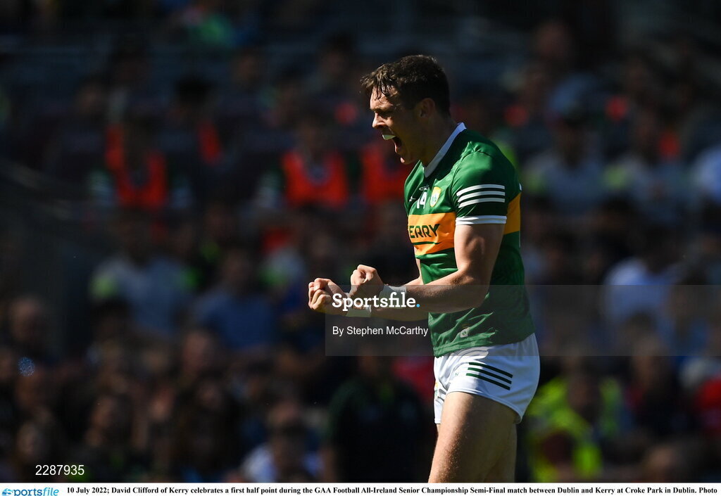 10 July 2022; David Clifford of Kerry celebrates a first half point during the GAA Football All-Ireland Senior Championship Semi-Final match between Dublin and Kerry at Croke Park in Dublin. Photo by Stephen McCarthy/Sportsfile