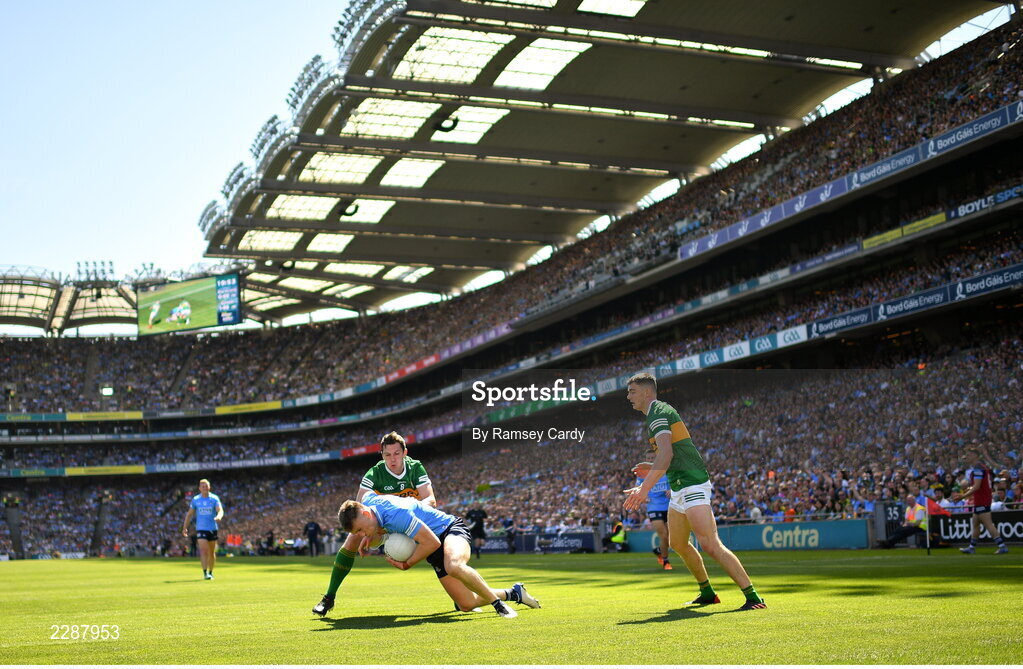 10 July 2022; Tom Lahiff of Dublin is tackled by David Moran of Kerry during the GAA Football All-Ireland Senior Championship Semi-Final match between Dublin and Kerry at Croke Park in Dublin. Photo by Ramsey Cardy/Sportsfile