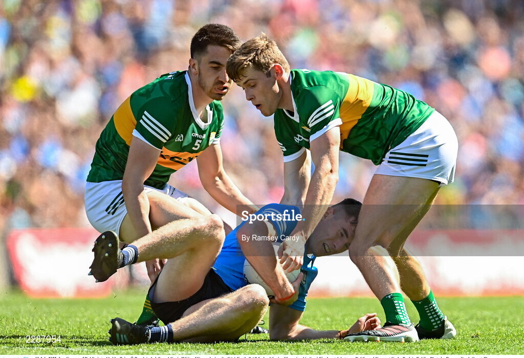 10 July 2022; Lee Gannon of Dublin is tackled by Brian Ó Beaglaíoch, left, and Gavin White of Kerry during the GAA Football All-Ireland Senior Championship Semi-Final match between Dublin and Kerry at Croke Park in Dublin. Photo by Ramsey Cardy/Sportsfile