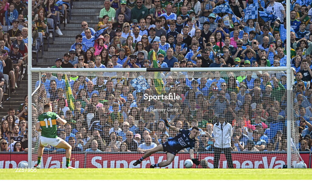10 July 2022; Dublin goalkeeper Evan Comerford saves a penalty by Seán O'Shea of Kerry during the GAA Football All-Ireland Senior Championship Semi-Final match between Dublin and Kerry at Croke Park in Dublin. Photo by Ramsey Cardy/Sportsfile