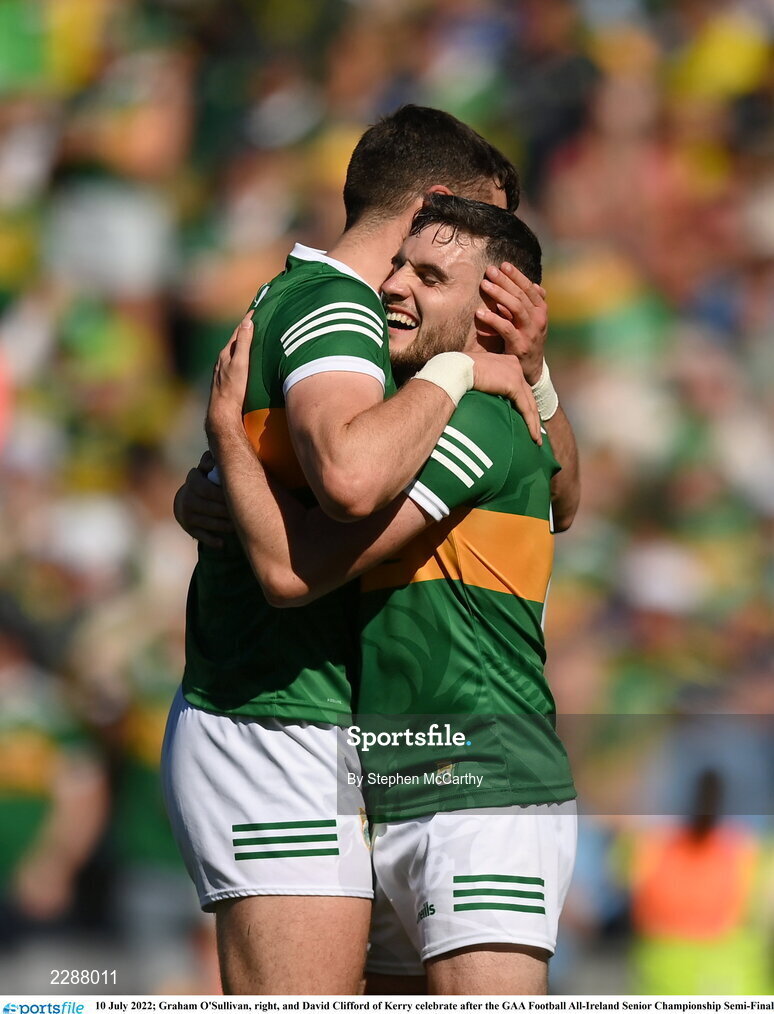 10 July 2022; Graham O'Sullivan, right, and David Clifford of Kerry celebrate after the GAA Football All-Ireland Senior Championship Semi-Final match between Dublin and Kerry at Croke Park in Dublin. Photo by Stephen McCarthy/Sportsfile