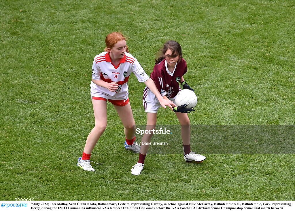 9 July 2022; Tori Molloy, Scoil Clann Naofa, Ballinamore, Leitrim, representing Galway, in action against Ellie McCarthy, Ballintemple N.S., Ballintemple, Cork, representing Derry, during the INTO Cumann na mBunscol GAA Respect Exhibition Go Games before the GAA Football All-Ireland Senior Championship Semi-Final match between Galway and Derry at Croke Park in Dublin. Photo by Daire Brennan/Sportsfile